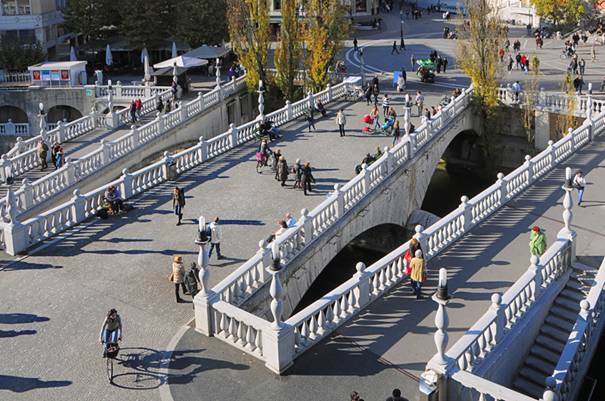 Üçlü Köprü: Ben adını gayet mantıklı buldum çünkü üç tane köprünün bir araya gelmesiyle oluşmuş bir yer. Şehrin ortasından Ljubljanica (bu da zor) Nehri geçiyor. Ve üzerinde de birkaç tane köprü var fakat en popüleri olan Üçlü Köprü olmuş. Bu köprü aynı zaman tarihi bir köprüymüş ve ilk yapım yılı 1280. Fakat deprem sonucunda yıkılınca günümüzdeki haliyle yeniden yapılmış.