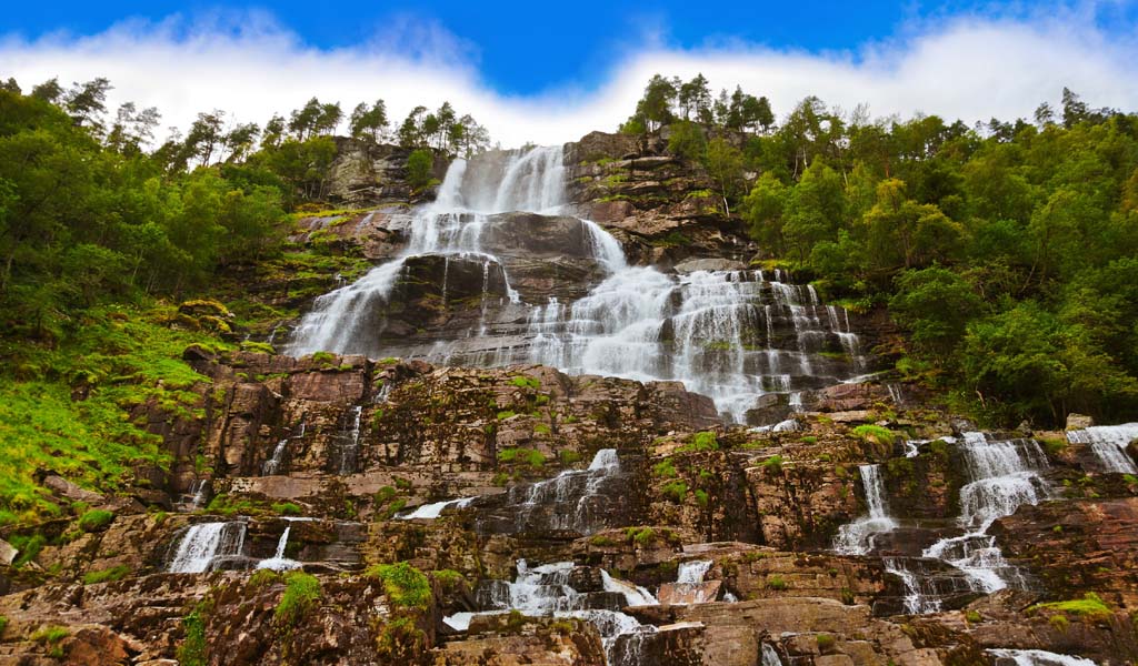 Bergen'den doğuya giden ana otoyolun üzerinde yer alan Tvindefossen, Norveç'in en popüler ve ünlü şelalelerinden biri. İskandinav Rüyası’nın Norveç rotası sırasında ziyaret edebileceğiniz Tvindefossen, aynı zamanda Avrupa’nın da en önemli doğal güzellikleri arasında yer alıyor. Şelalenin sahip olduğu su, birçok küçük şelaleyi oluşturan taş basamakların üzerinden akıyor.